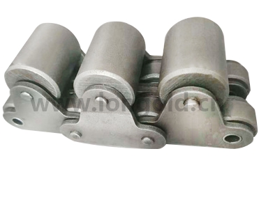 ◎ 雙節(jié)距頂置滾子鏈條是將雙倍節(jié)距鏈的鏈板向上伸長,在伸長部分安裝可自由滾動的頂置滾子的自由流動鏈。