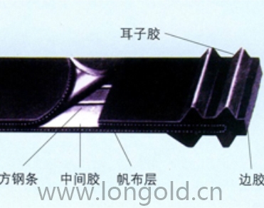 ◎ 沿膠帶橫向鋪設(shè)方鋼條,其間以橡膠填充,用膠布包覆成為帶芯,并覆蓋上、下覆蓋層,在由此構(gòu)成的帶體兩邊設(shè)置耳膠,邊膠。